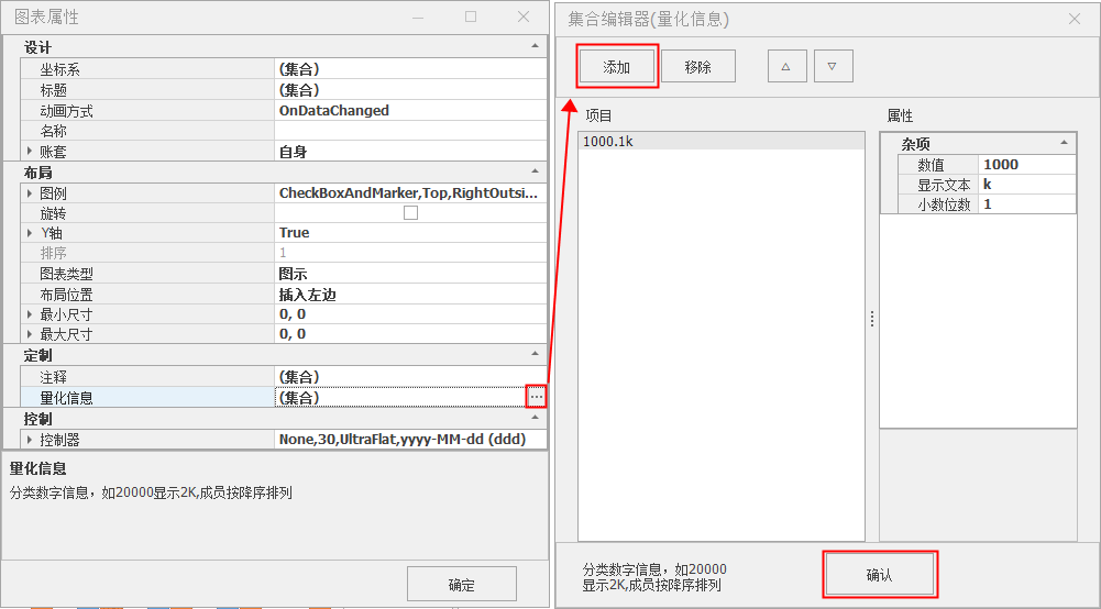 [可选步骤]7、点击【量化信息】后的【···】按钮→弹出【集合编辑器(量化信息)】→点击【添加】→输入数值(如:1000)→输入显示文本(如:k)→输入小数位数(如:1)→完成后点击【确认】。